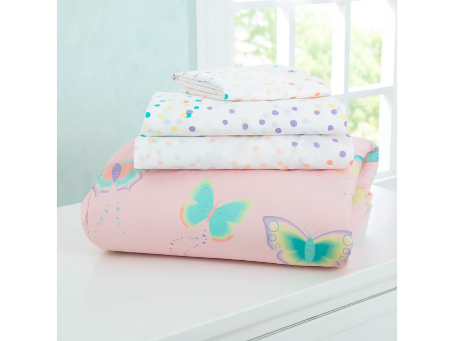 NNOVATIVE DESIGN: Innovative top flat sheet and comforter have elastic bottoms/corners to keep them in place in place all night long + makes bed making neat and easy WHAT’S INCLUDED: This 4-piece reversible toddler boy bedding set includes: reversible toddler comforter with elastic bottom, flat top sheet with elastic bottom, fitted bottom sheet and standard size pillowcase PERFECT FIT: Fits a standard size US crib/toddler mattress 27″ x 52″ | Quilt: 51.5″ (length )x 27″ (width) | Pillowcase: 27.5″ (length) x 18.3″ (height) COZY SLEEP SPACE: Comforter material: 100% polyester, 100% polyester fill | Sheet/pillowcase material: 80% polyester 20% cotton