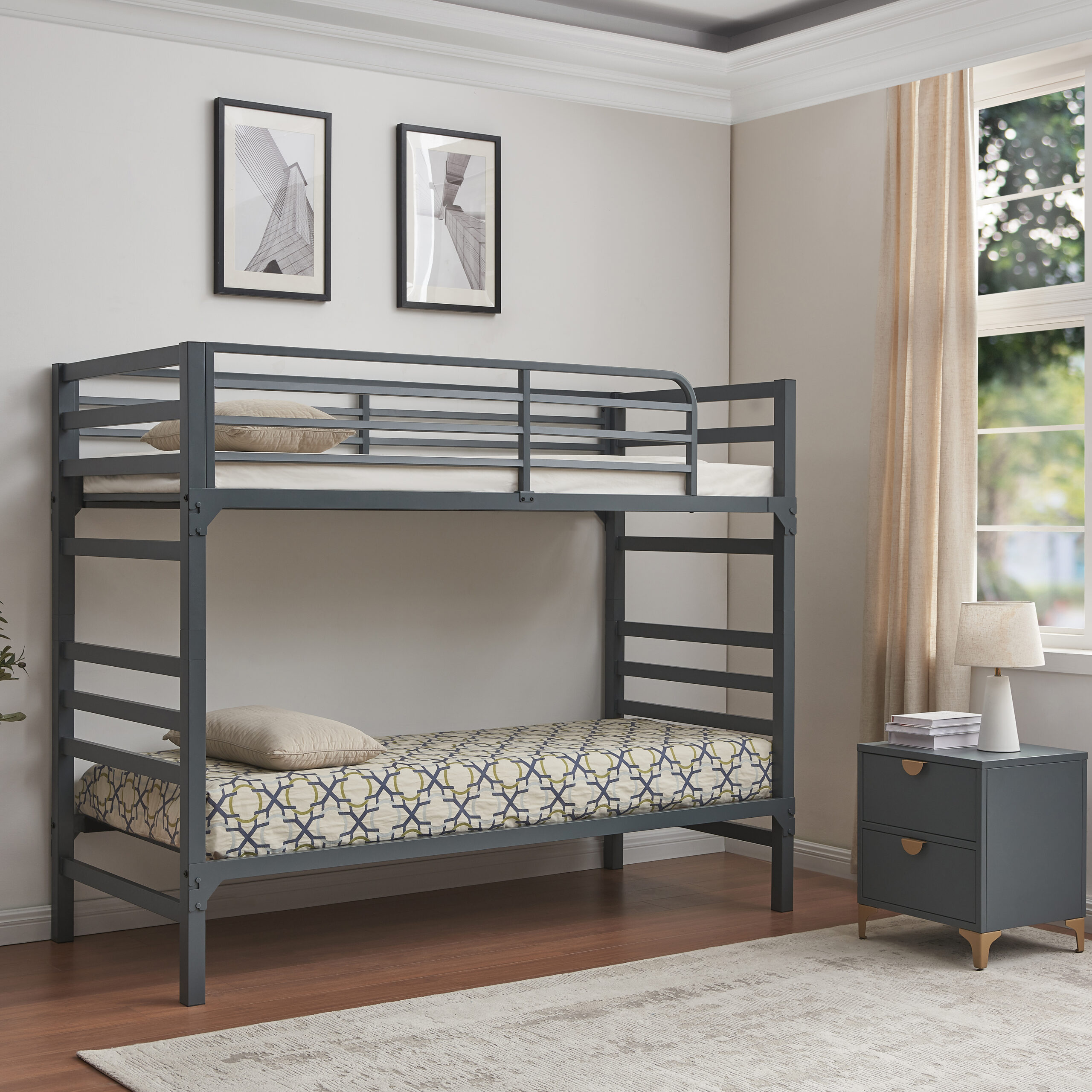 Bunk Bed is a robust and useful addition to any space. Crafted from heavy duty metal with two guardrails on either side, this bed is built to withstand the test of time. The unique design allows it to be easily converted into two separate twin beds, making it a versatile addition to any room.