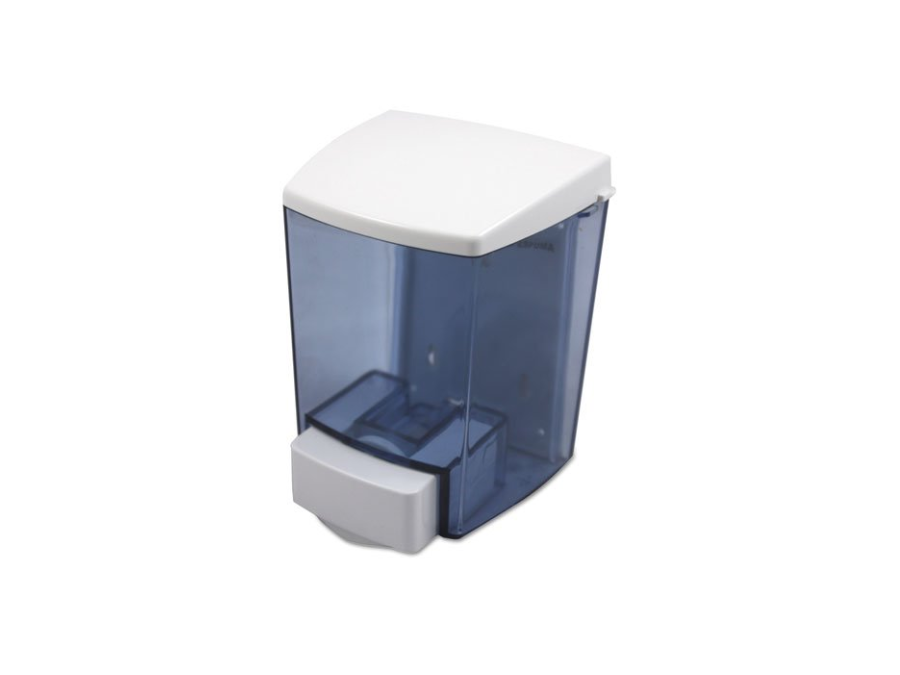 Soap dispenser eliminates soap waste by dispensing approximately 1cc per stroke. 30-oz. capacity accommodates liquid and lotion soaps except pumice. Dispenser is tested and proven to work with antimicrobial, antibacterial and antiseptic soaps. Large push bar meets ADA requirements. Dispenser also features a water-resistant top, curved design and see-through tank.