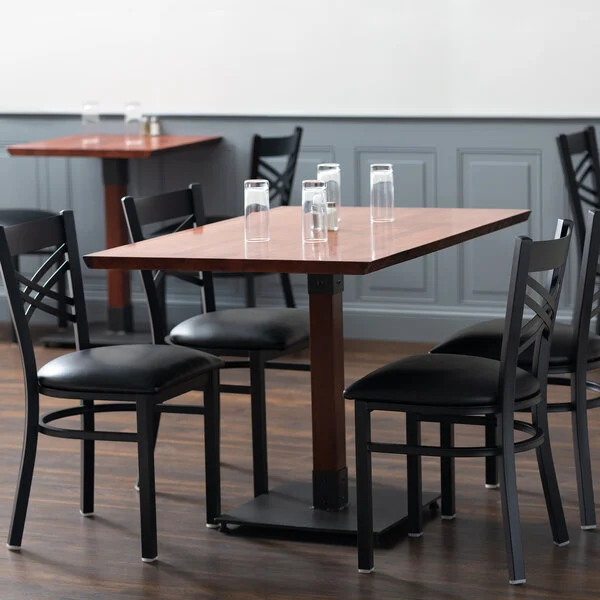 Feature beautiful wood with reliable durability in your dining room by choosing this Lancaster Table & Seating industrial 30″ x 48″ solid wood live edge table with mahogany finish. Complete with an attractive table top and compatible table base, this table is the perfect addition to your winery, brewery, or farm-to-table eatery. It combines the natural look of wood with rugged metal accents to add a rustic element with contemporary flair to your establishment. The mahogany finish highlights the distinctive woodgrain patterns and gives the table a unique aesthetic that can’t be duplicated.