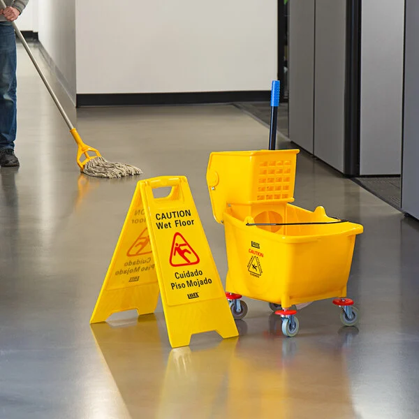 When efficiency, user-friendly features, and convenience combine, you get this Lavex wet mop kit with 35 qt. yellow mop bucket, wet floor sign, mop head, and handle.